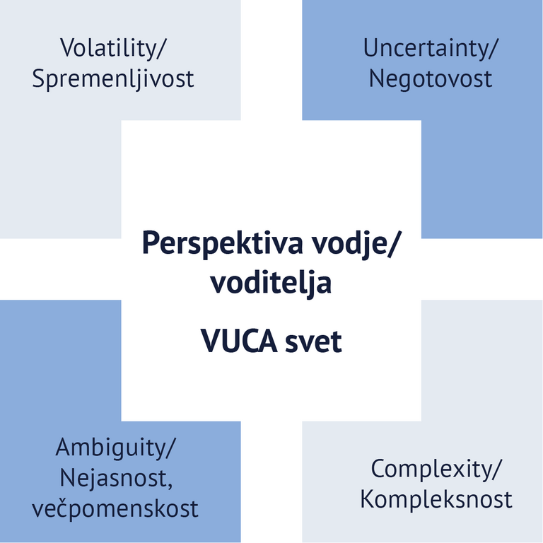 V 'VUCA' svetu se delovni pogoji nenehno spreminjajo, temelji za sprejemanje odločitev postajajo čedalje bolj kompleksni in negotovi, zaznamuje pa ga tudi svojevrstna večpomenskost. Izziv za novodobne voditelje je toliko bolj zahteven (glej shemo).